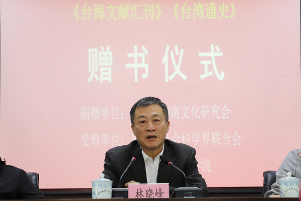 贈(zèng)書儀式上,林曉峰、周旻、潘少鑾等同志分別作了講話。林曉峰會(huì)長(zhǎng)表示,此次贈(zèng)書活動(dòng)是福建省閩南文化研究會(huì)高度重視閩南文化工作,著力加強(qiáng)對(duì)臺(tái)灣歷史學(xué)術(shù)研究,促進(jìn)海峽兩岸中華傳統(tǒng)文化傳承,加強(qiáng)兩岸共同精神家園研究建設(shè)的重要舉措,對(duì)推進(jìn)兩岸融合發(fā)展建言獻(xiàn)策必將產(chǎn)生積極作用。市社科聯(lián)主動(dòng)收藏這兩套重要文獻(xiàn),是廈門市社科聯(lián)重視重要典籍資料的收藏,主動(dòng)抓好兩岸閩南歷史文化研究的具體體現(xiàn)。黨史學(xué)習(xí)教育中,廈門社科聯(lián)十分注重抓好“我為群眾辦實(shí)事”活動(dòng),著眼社科特色,注重為社科界辦實(shí)事、為社科工作者辦實(shí)事。圍繞“第一家園”“第一站”建設(shè),推動(dòng)兩岸融合交流,為閩南文化繁榮和傳承,廈門社科聯(lián)做了大量詳實(shí)細(xì)致工作,前期舉辦的“海峽兩岸(廈門)共同精神家園暨融合路徑發(fā)展論壇”就是社科界“我為群眾辦實(shí)事”的生動(dòng)實(shí)踐。