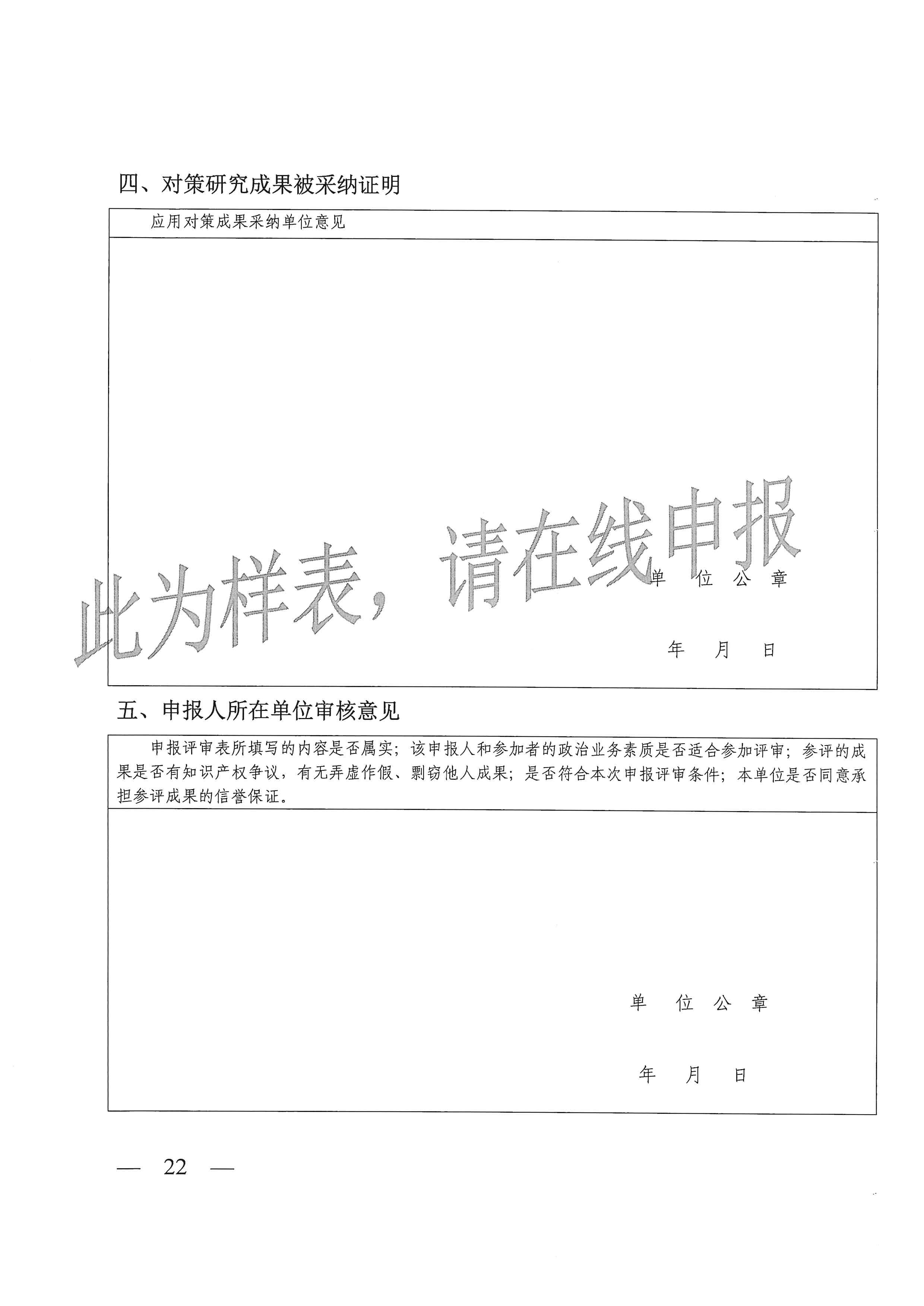 3.申報(bào)參評(píng)的研究成果,其發(fā)表的時(shí)間,上限為2019年1月1日,下限為2021年12月31日。由出版社出版的,以第一次出版印刷的時(shí)間為準(zhǔn),再版、再印時(shí)間無(wú)效;刊物發(fā)表的以第一次發(fā)表為準(zhǔn),轉(zhuǎn)載和摘登的日期無(wú)效;沒(méi)有出版或發(fā)表的對(duì)策咨詢(xún)成果,根據(jù)其被市、區(qū)兩級(jí)實(shí)際部門(mén)采用的時(shí)間來(lái)確定,并附相關(guān)證明材料;