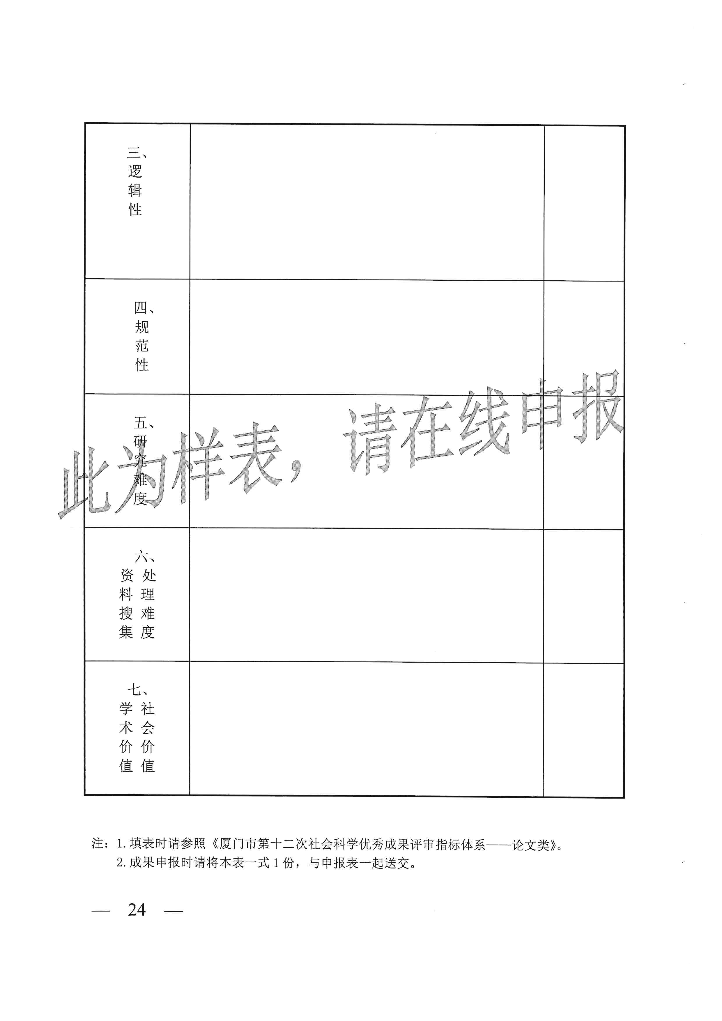 3.廈門(mén)市第十二次社會(huì)科學(xué)優(yōu)秀成果評(píng)審表——論文類(lèi)、調(diào)研報(bào)告、決策咨詢(xún)報(bào)告類(lèi)、著作類(lèi)(樣表)