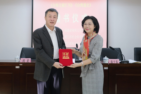 贈(zèng)書儀式上,林曉峰、周旻、潘少鑾等同志分別作了講話。林曉峰會(huì)長(zhǎng)表示,此次贈(zèng)書活動(dòng)是福建省閩南文化研究會(huì)高度重視閩南文化工作,著力加強(qiáng)對(duì)臺(tái)灣歷史學(xué)術(shù)研究,促進(jìn)海峽兩岸中華傳統(tǒng)文化傳承,加強(qiáng)兩岸共同精神家園研究建設(shè)的重要舉措,對(duì)推進(jìn)兩岸融合發(fā)展建言獻(xiàn)策必將產(chǎn)生積極作用。市社科聯(lián)主動(dòng)收藏這兩套重要文獻(xiàn),是廈門市社科聯(lián)重視重要典籍資料的收藏,主動(dòng)抓好兩岸閩南歷史文化研究的具體體現(xiàn)。黨史學(xué)習(xí)教育中,廈門社科聯(lián)十分注重抓好“我為群眾辦實(shí)事”活動(dòng),著眼社科特色,注重為社科界辦實(shí)事、為社科工作者辦實(shí)事。圍繞“第一家園”“第一站”建設(shè),推動(dòng)兩岸融合交流,為閩南文化繁榮和傳承,廈門社科聯(lián)做了大量詳實(shí)細(xì)致工作,前期舉辦的“海峽兩岸(廈門)共同精神家園暨融合路徑發(fā)展論壇”就是社科界“我為群眾辦實(shí)事”的生動(dòng)實(shí)踐。